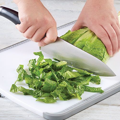 Did you know that cutting the lettuce into long, thin strips is called chiffonade? It’s the French phrase for “made of rags”, and the technique is commonly used for slicing basil, mint and leafy greens. See step 4.
